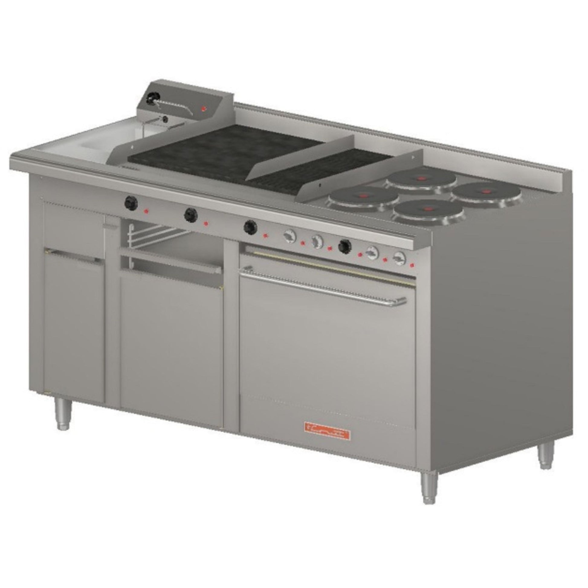 ESTUFA ELÉCTRICA CORIAT MÚLTIPLE-E, ACERO INOXIDABLE, COMBINACIÓN DE 4 PLATOS HIERRO FUNDIDO 2600W C/U CON CONTROL INDEPENDIENTE, PLANCHA COLD ROLLED 0.504X0.54M, ASADOR 0.29X0.54M CON RESISTENCIA 3350W, GRATINADOR 0.435X0.60M, FREIDOR 3 LITROS CON RESISTENCIA 1800W, HORNO 0.66X0.58X0.43M CON RESISTENCIA 4870W, PUERTA ABISAGRADA CON JUNTA ALTA TEMPERATURA, RESPALDO BAJO 0.09M, 4 PATAS NIVELADORAS ACERO INOXIDABLE, DIMENSIONES 1.71X0.81X1.07M, PESO 300 KG, 220V, 67A/LÍNEA, 27120W, 60HZ, CONSUMO 27.1KW/H.
