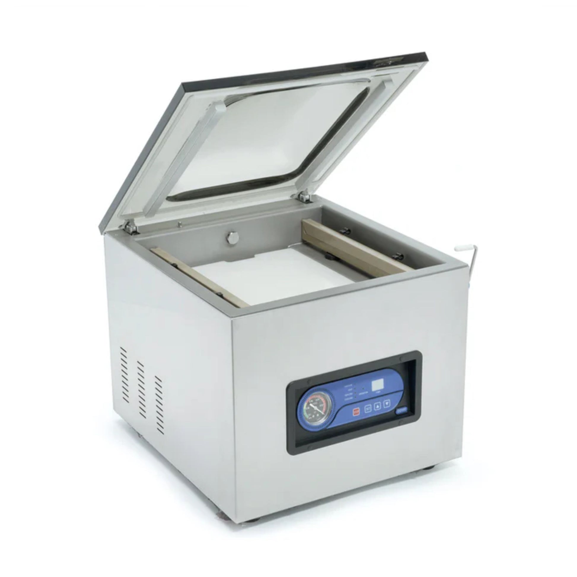 MARCA MIGSA. FABRICADO EN ACERO INOXIDABLE, DOBLE BARRA SELLADORA DE 40 X 1.3 CM CAMPANA DE ACRÍLICO TRANSPARENTE, FUNCIONAMIENTO ELÉCTRICO 220 V / 60 HZ / 2F, BOMBA DE 20 M3/H Y POTENCIA DE 900 W Y 4.1 A. MEDIDAS CÁMARA: 42 X 42 X 16 CM. MEDIDAS EXT.: 49.9 X 54 X 49.5 CM.