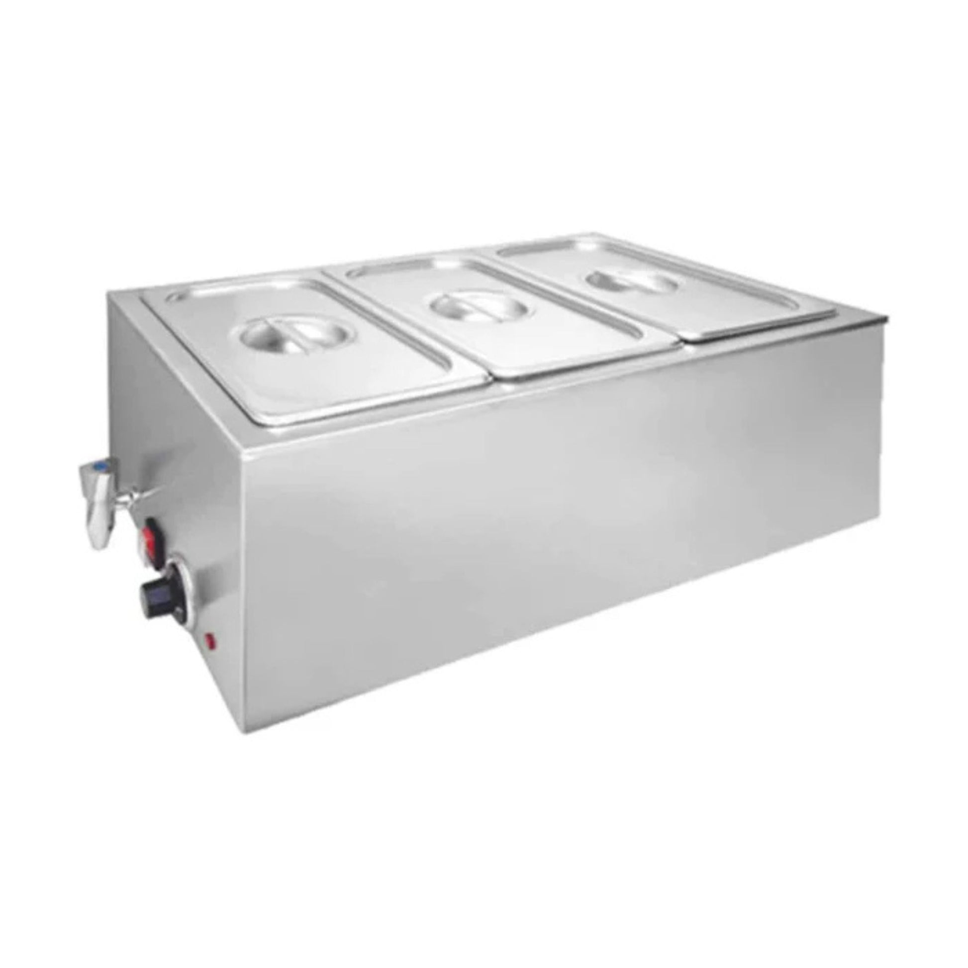 MARCA MIGSA. FABRICADO EN ACERO INOXIDABLE, EQUIPADO CON 3 INSERTOS TERCIOS DE 32 X 17 X 15 CM DE FONDO CON TAPAS (SE PUEDE COMBINAR CON OTRAS MEDIDAS). BOTÓN DE ENCENDIDO Y APAGADO, CONTROL DE TEMPERATURA, FOCO PILOTO INDICADOR Y LLAVE DE DRENAJE, POTENCIA DE 1,200 W A 110 V / 60 HZ. PESO NETO DE 7.1 KG. MEDIDAS: 37 X 57 X 24 CM. CÓDIGO SAT/ 48101501.